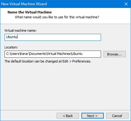 #4. Name the virtual machine then select a location to install there and click Next.